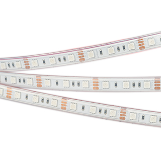 Герметичная лента IP66 (в силиконовой трубке), светодиоды smd 5060, 60шт/м (300шт на 5м), белая плата 10мм, скотч 3М. Цвет Мультицвет R/G/B. Питание 12V, мощность 14.4 Вт/м (72 Вт на 5м), угол 120°. Размеры 5000х13x5мм. Мин.отрезок 50мм, 3 светодиода. Цена за 1м.