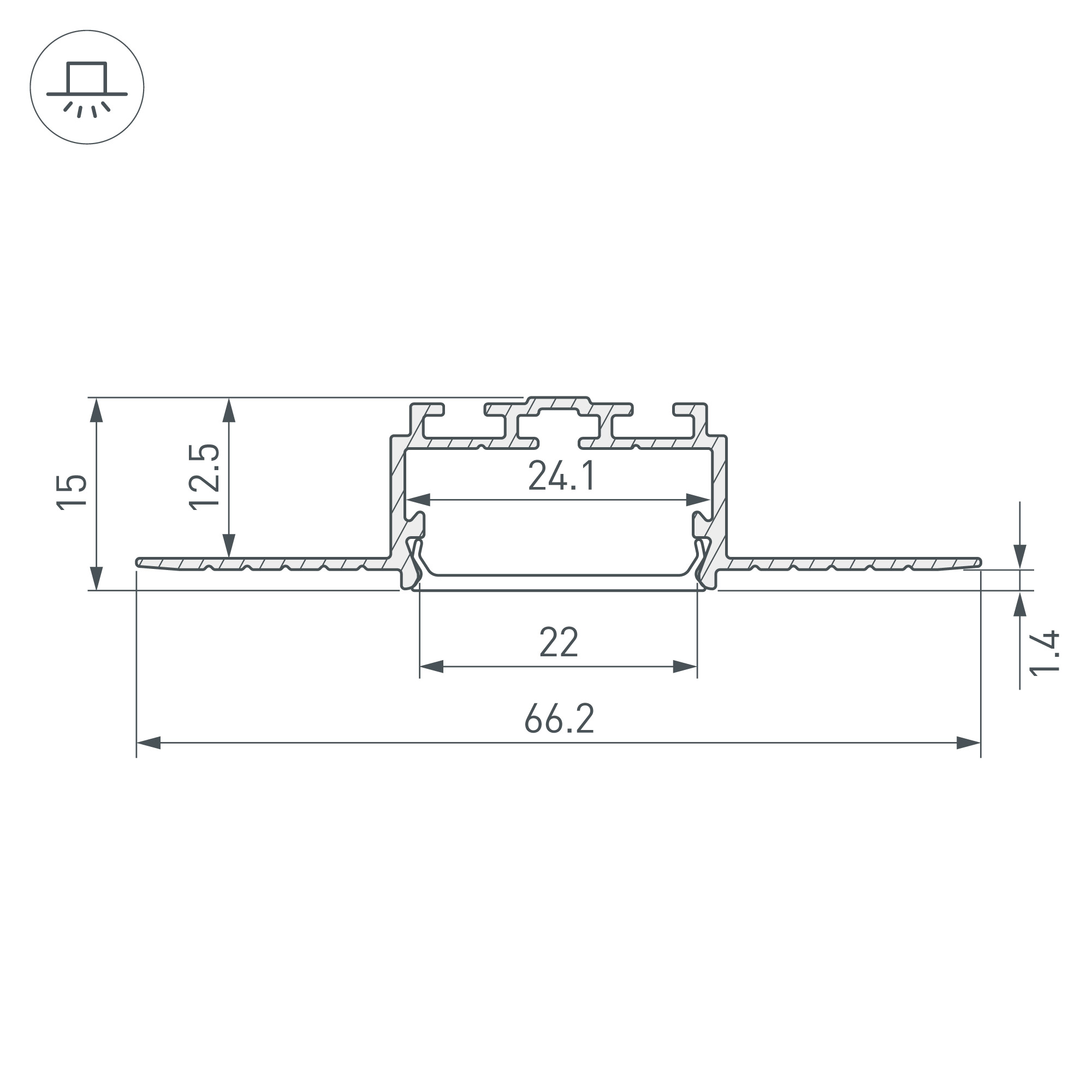 Алюминиевый профиль для светодиодных лент и линеек. Встраиваемый в гипсокартон толщиной 12,5 мм, под строительную отделку. Позволяет создать линию света шириной 24 мм. без видимых частей алюминия. Габаритные размеры (L×W×H): 2000x66,2x15 мм. Ширина площадки для ленты 24 мм. Экраны, заглушки и другие аксессуары приобретаются отдельно. Цена за 1 метр.