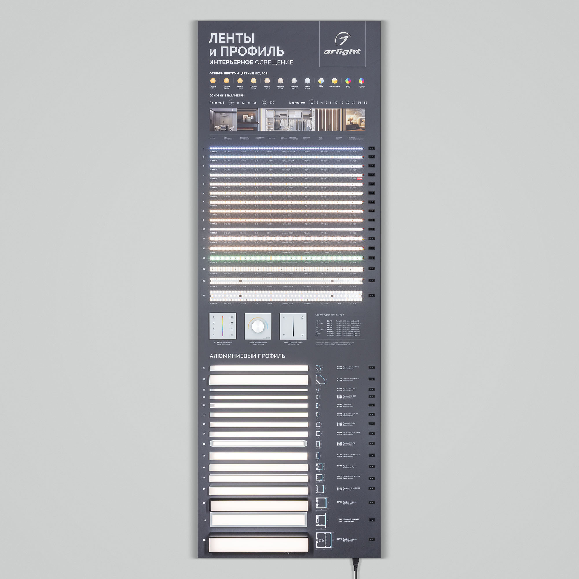 Обзорный стенд по ассортименту светодиодных лент и профилей.